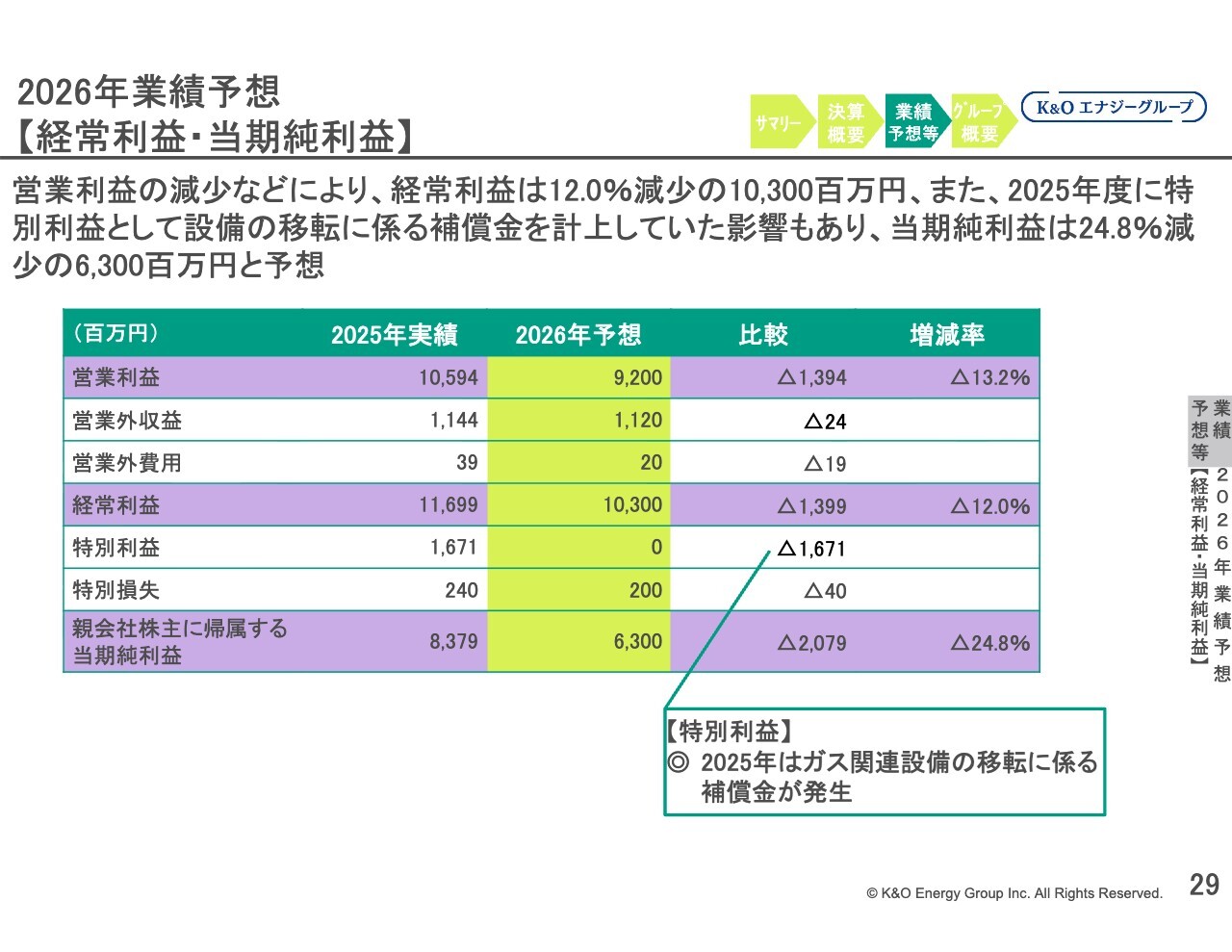 また、経常利益の減少に加え、2025年に発生した特別利益が剥落したことなどにより、親会社株主に帰属する当期純利益は前期比24.8パーセント減少の63億円と予想しています。