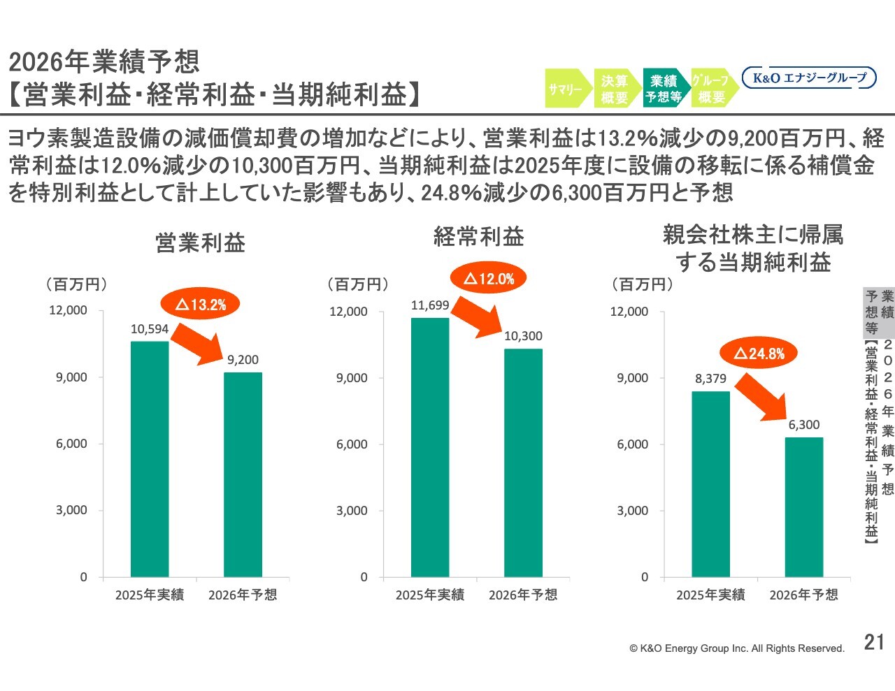 営業利益は、地熱調査費の増加やヨウ素製造設備における減価償却費の増加などにより、前期比13.2パーセント減少の92億円となる見込みです。経常利益は主に営業利益の減少の影響を受け、前期比12.0パーセント減少の103億円を見込んでいます。