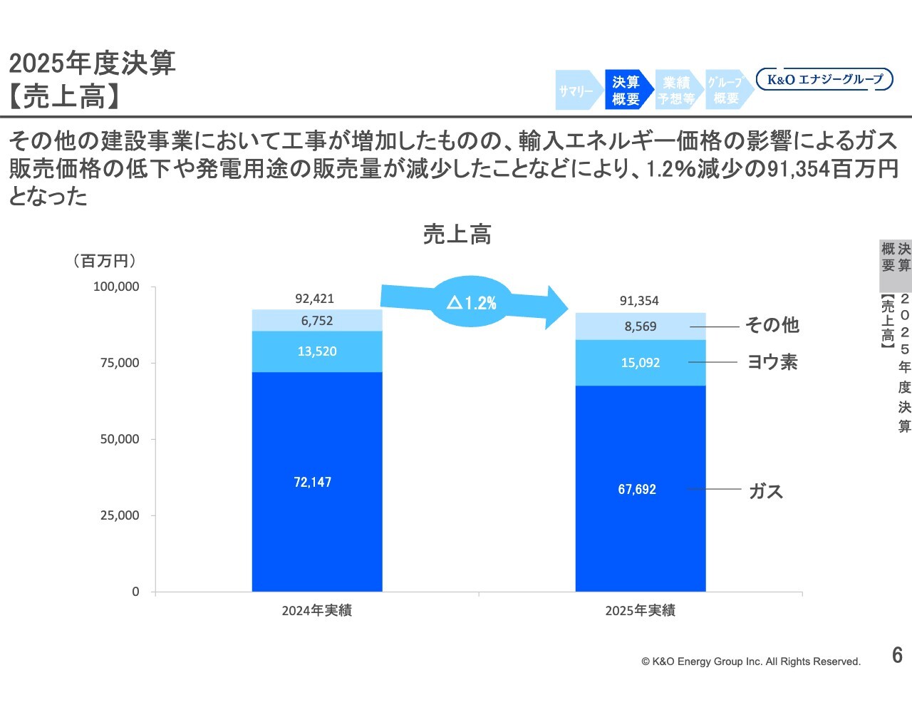ガス事業の売上高は、輸入エネルギー価格の影響によりガス販売価格が低下しました。これに加え、発電用途でのガス販売量の減少などにより、前期比6.2パーセント減少の676億9,200万円となりました。