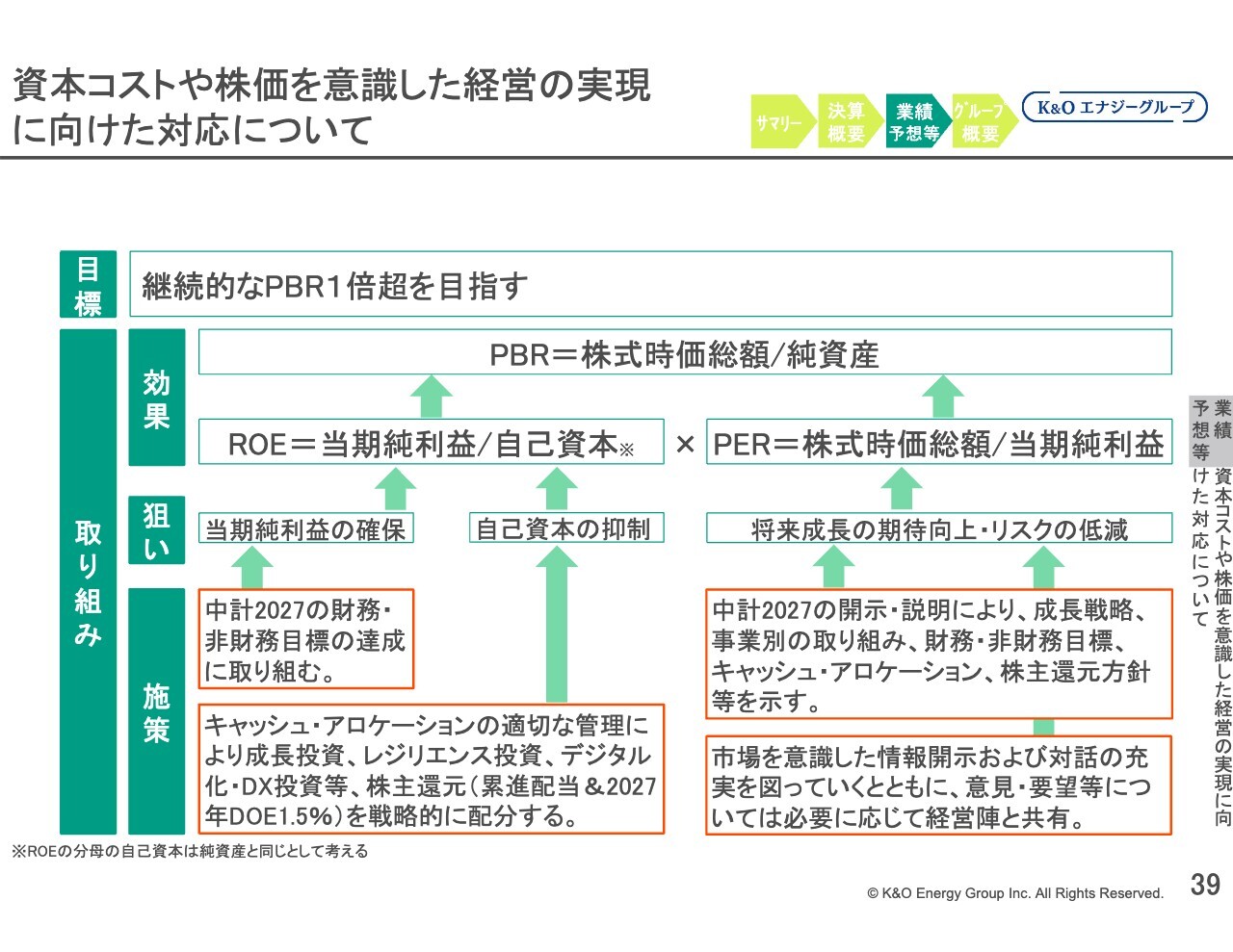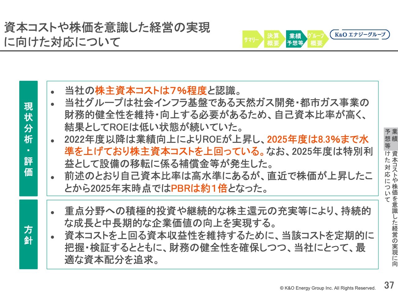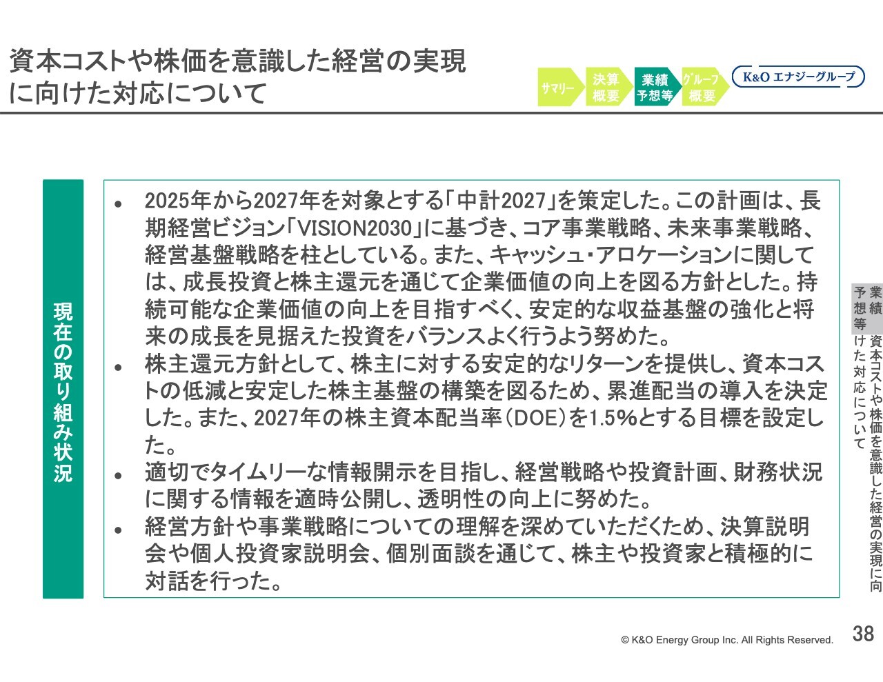 現在の取り組み状況については大きな変更はありません。資本コストや株価を意識した経営の実現に向け、2025年から2027年を対象とする「中計2027」を策定しています。この内容に基づき、安定的な収益基盤の強化と将来の成長を見据えた投資をバランスよく行い、持続可能な企業価値の向上を目指しています。