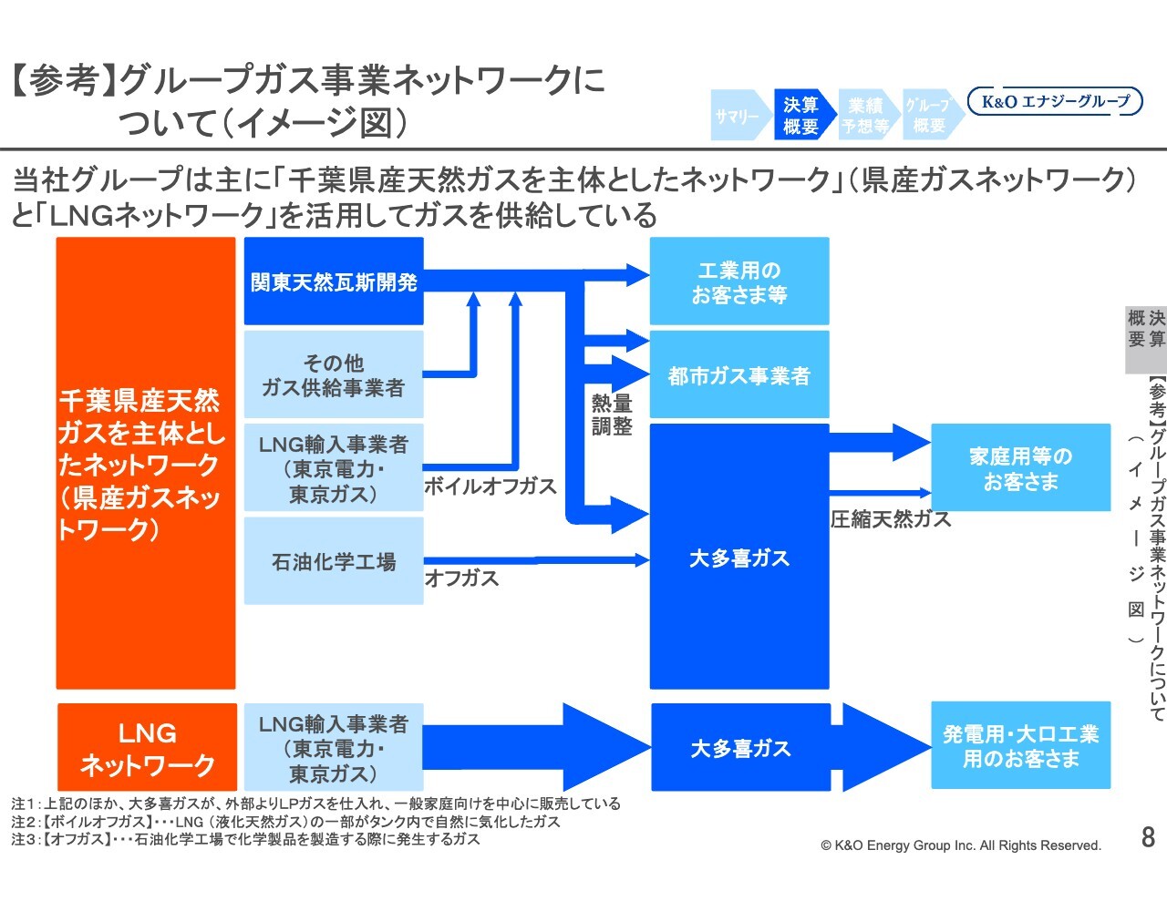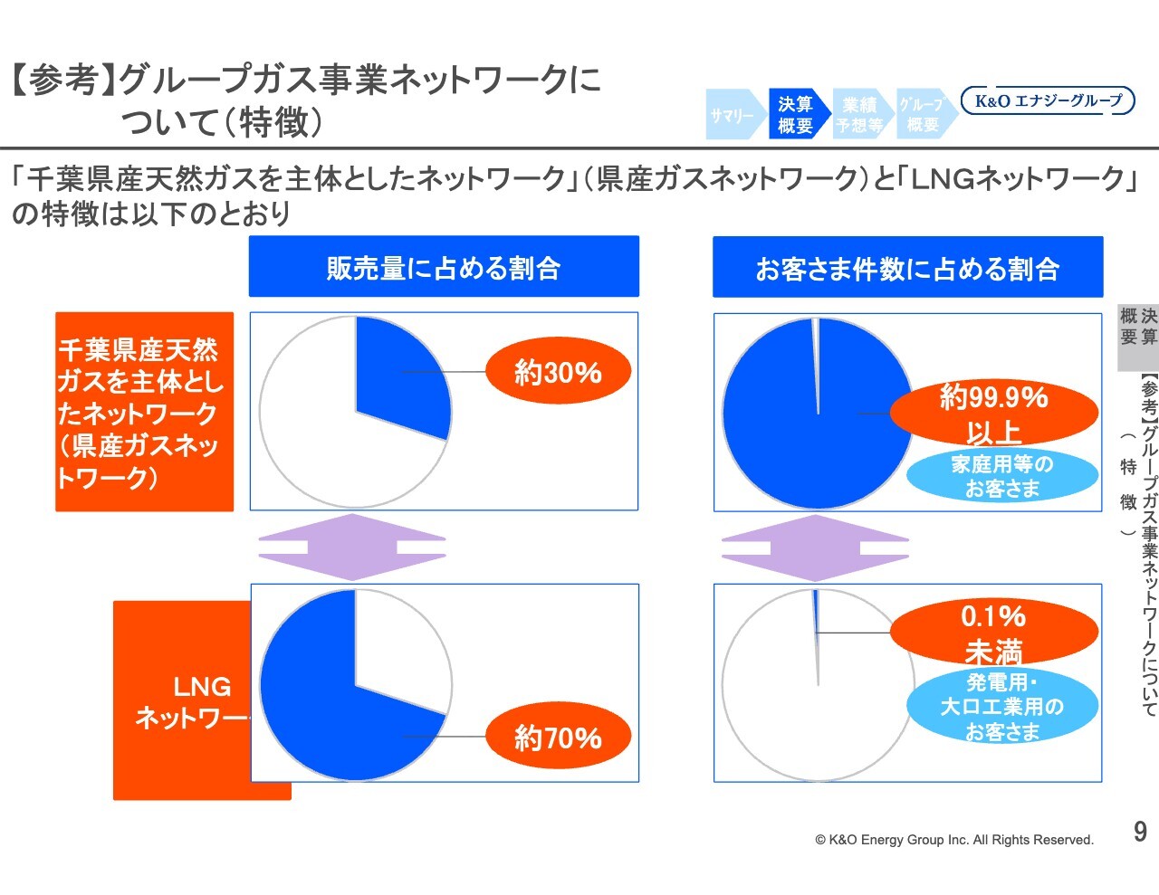 スライド下段のLNGネットワークでは、子会社の大多喜ガスがLNG輸入事業者から購入したガスを、発電用を含む大口工業用のお客さまなどに供給・販売しています。県産ガスネットワークとLNGネットワークの販売量の比率は次のページにも記載していますが、LNGネットワークが約7割を占めています。