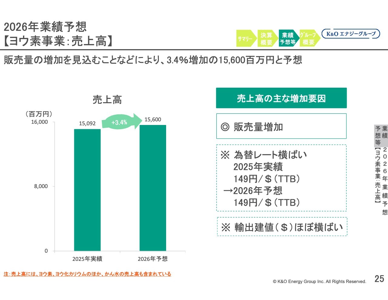 八代:今年2026年のヨウ素価格についてですが、こちらは為替と建値を踏まえると、ほぼ2025年、前期並みと見通しています。