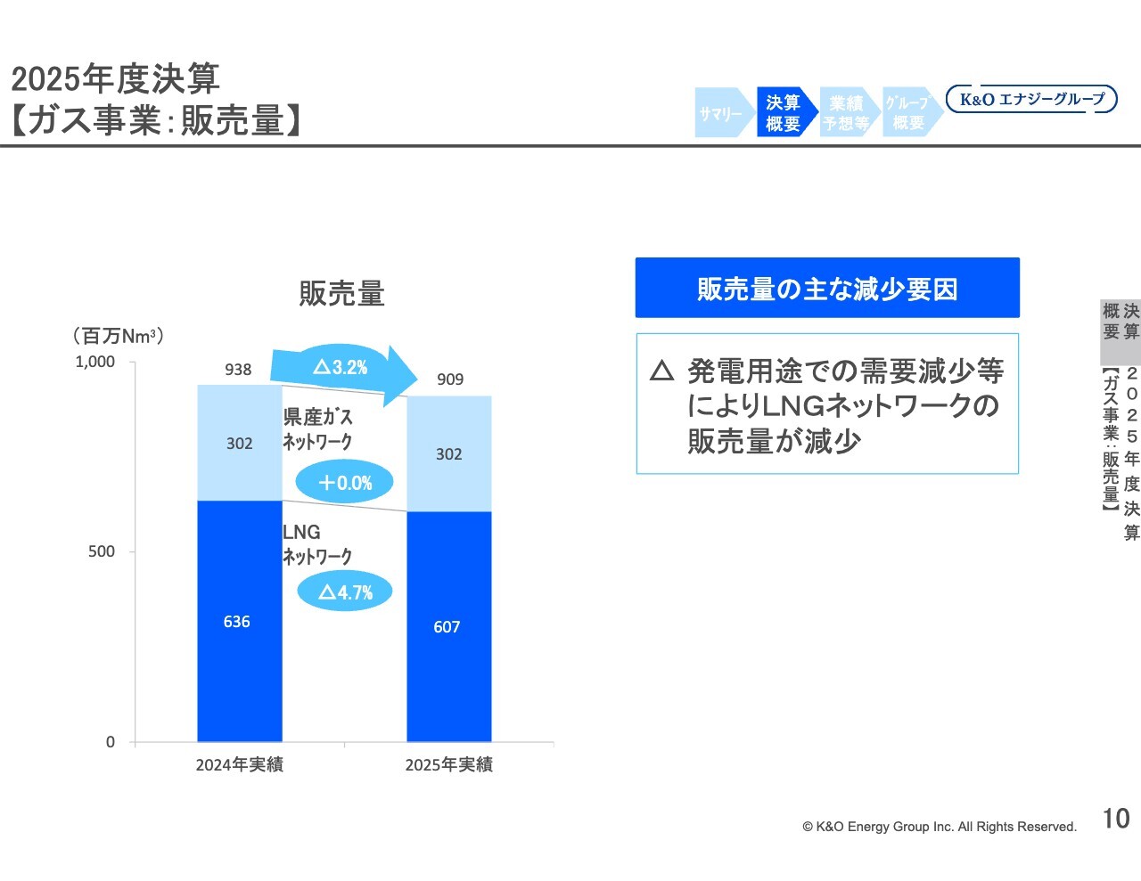 ガス事業の販売量は、大口工業用向け販売量の減少などにより、県産ガスネットワークおよびLNGネットワークともに減少し、全体では前期比1.1パーセント減少の8億9,900万立方メートルとなる見通しです。