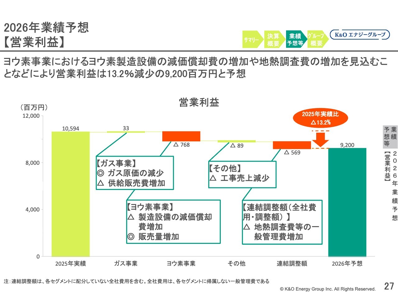 連結調整額(全社費用・調整額)は、主に地熱調査費の増加などから5億6,900万円の利益減少となる見通しです。