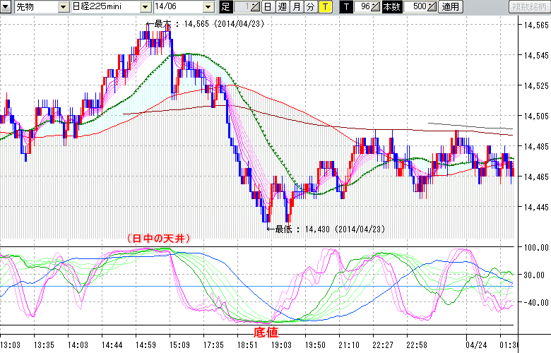 日経平均は ¥14,388.77 (-123.61) 続落 ボリンジャーバンド(25日)は、-0.4 σ JPX日経インデックス400は ¥10,579.99 (-75.43) 225mini(6月限) 大引け ¥14,350 (-175) 東証一部の25日騰落レシオは 98.96東証一部の出来高は 16.5 億株 相場は下落。 出来高は20億株割れを継続中。ドル/円は 102円台半ば。 -