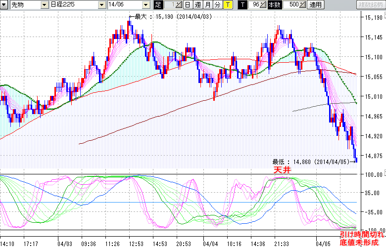 日経平均は ¥14,299.69 (-307.19) 4日続落 ボリンジャーバンド(25日)は、-1.4 σ JPX日経インデックス400は ¥10,467.88 (-211.75) 225mini(6月限) 大引け ¥14,380 (-210) 東証一部の25日騰落レシオは 90.34東証一部の出来高は 23.3 億株 相場は大幅下落。 出来高は20億株を回復。ドル/円は 102円前後。 -