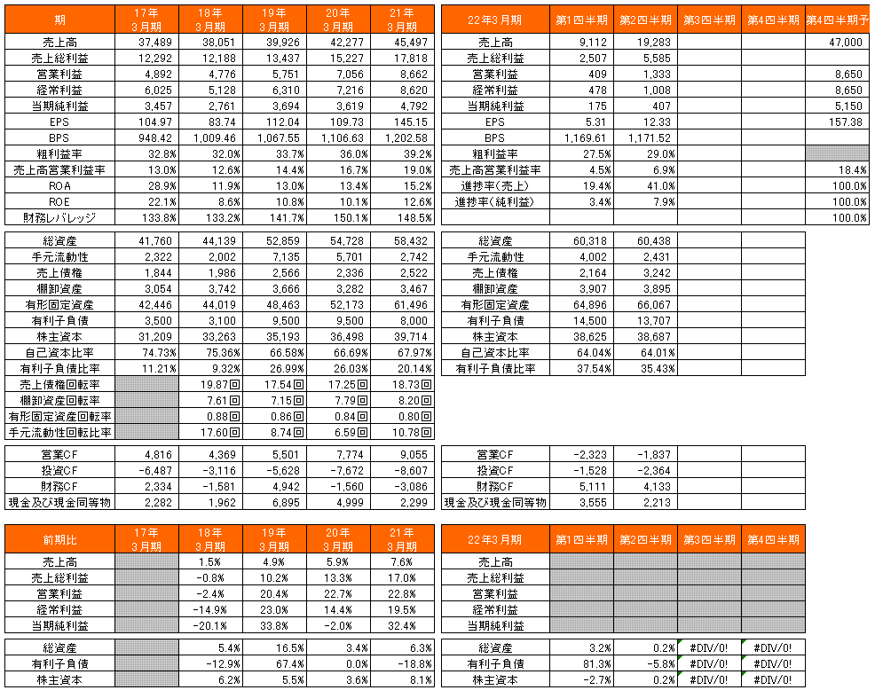過去の経営成績を見ると、粗利益率は年々改善され約40%で推移。同じように売上高営業利益率も19%まで上昇している。毎期第三四半期から利益が乗ってくる体質なので、第二四半期の粗利率、営業利益率は気にする必要はなさそうだ。