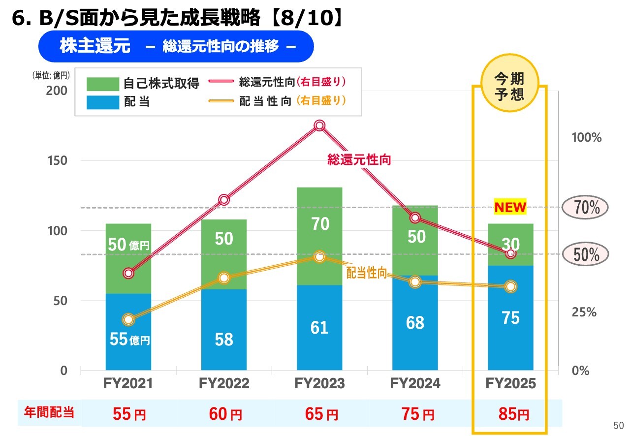 2025年度も増収増益の計画であることから、配当は前年度同様10円増配の年間85円、自己株式取得30億円を決議しました。これにより現時点での総還元性向は約50パーセントとなります。