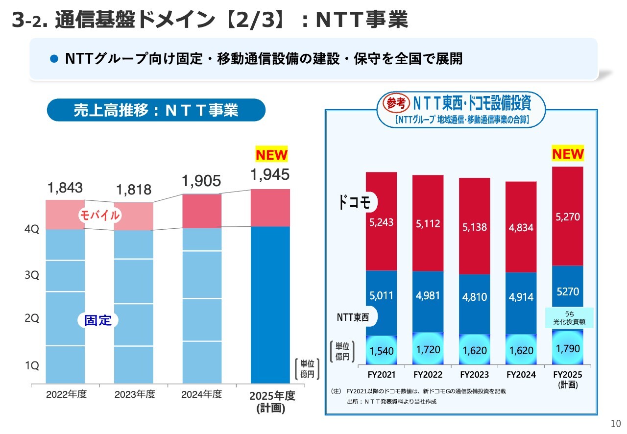 基本的に受注は今かなり控えめに見ていますが、売上高では2024年度に対してプラスで見ている状況です。2025年度は、施工をしっかりと行い、完工を増やしていくことでしっかりと売上につなげるよう注力していきたいと考えています。したがって、NTTグループの投資増に対しても、それに見合ったかたちで売上を上げていく計画です。
