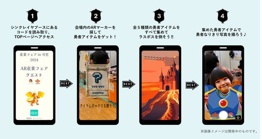 当社ブースや協力企業に設置される特定の絵柄をスマートフォンのカメラにかざすと、ラスボスを倒すための勇者アイテムがARで出現。全5か所にちりばめられたアイテムを集める楽しさがあります。