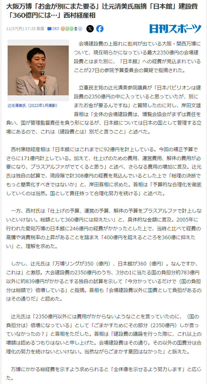 「万博リングが350(億円)、日本館が360(億円)。なんですか、これは」