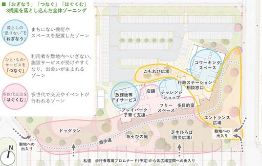 当拠点は、「おぎなう」「つなぐ」「はぐくむ」の3つの機能に分かれています。これらの機能を、 目的以外のゾーンも視認できるように拠点内に配置することで多世代交流を促進し、利用者同士で 新たなつながりが生まれやすい環境を提供しています。