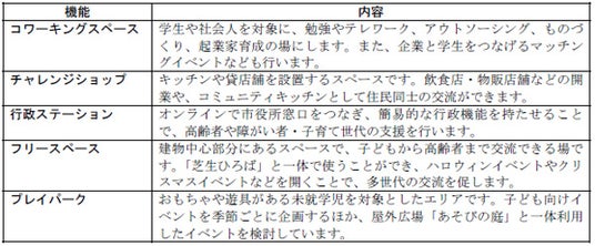 主な拠点機能:フリースペース、チャレンジショップ、コワーキングスペース、プレイパーク、スマート行政ステーション、児童発達支援室・放課後等デイサービス、飲食・物販店 など