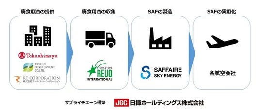 株式会社高島屋(本社:大阪市中央区、代表取締役社長:村田善郎、以下「高島屋」)および同社連結子会社である東神開発株式会社(本社:東京都世田谷区、代表取締役社長:倉本真祐、以下「東神開発」)、株式会社アール・ティー・コーポレーション(本社:東京都中央区、代表取締役社長:高田明宏、以下「RTC」)は、日揮ホールディングス株式会社(代表取締役会長 CEO:佐藤雅之、以下「日揮HD」)、株式会社レボインターナショナル(代表取締役 CEO:越川哲也、以下「レボインターナショナル」)、並びに合同会社SAFFAIRE SKY ENERGY(代表職務執行者:秋鹿正敬、以下「SAFFAIRE SKY ENERGY」)と、国産の持続可能な航空燃料(Sustainable Aviation Fuel。以下、SAF)の原料となる使用済み食用油(以下「廃食用油」)の継続的な供給および、その利用に関する基本合意書を9月30日付で締結しました。