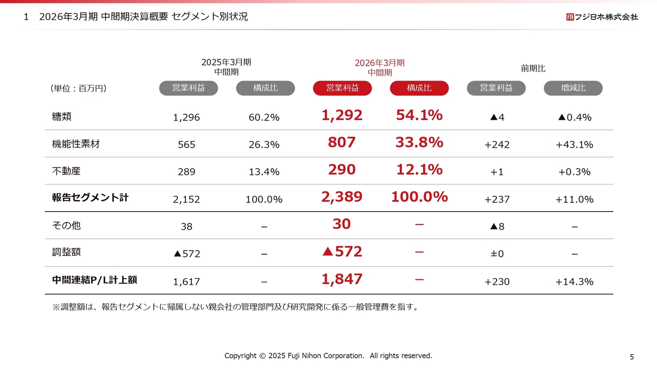 不動産事業は、2025年2月に資本効率向上の一環として実施した物件売却により減収となりましたが、先述した糖類事業・機能性素材事業の伸長により、全体では増収増益にて着地しました。