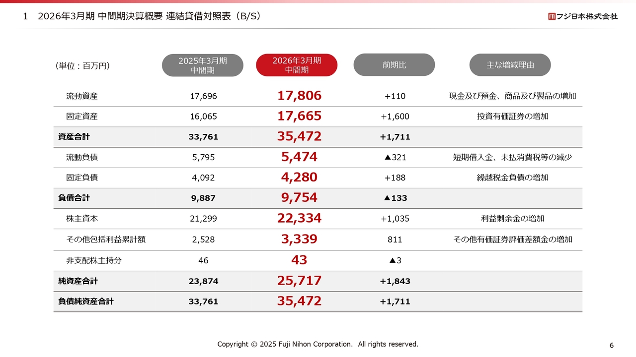 1 2026年3月期 中間期決算概要 連結貸借対照表(B/S)