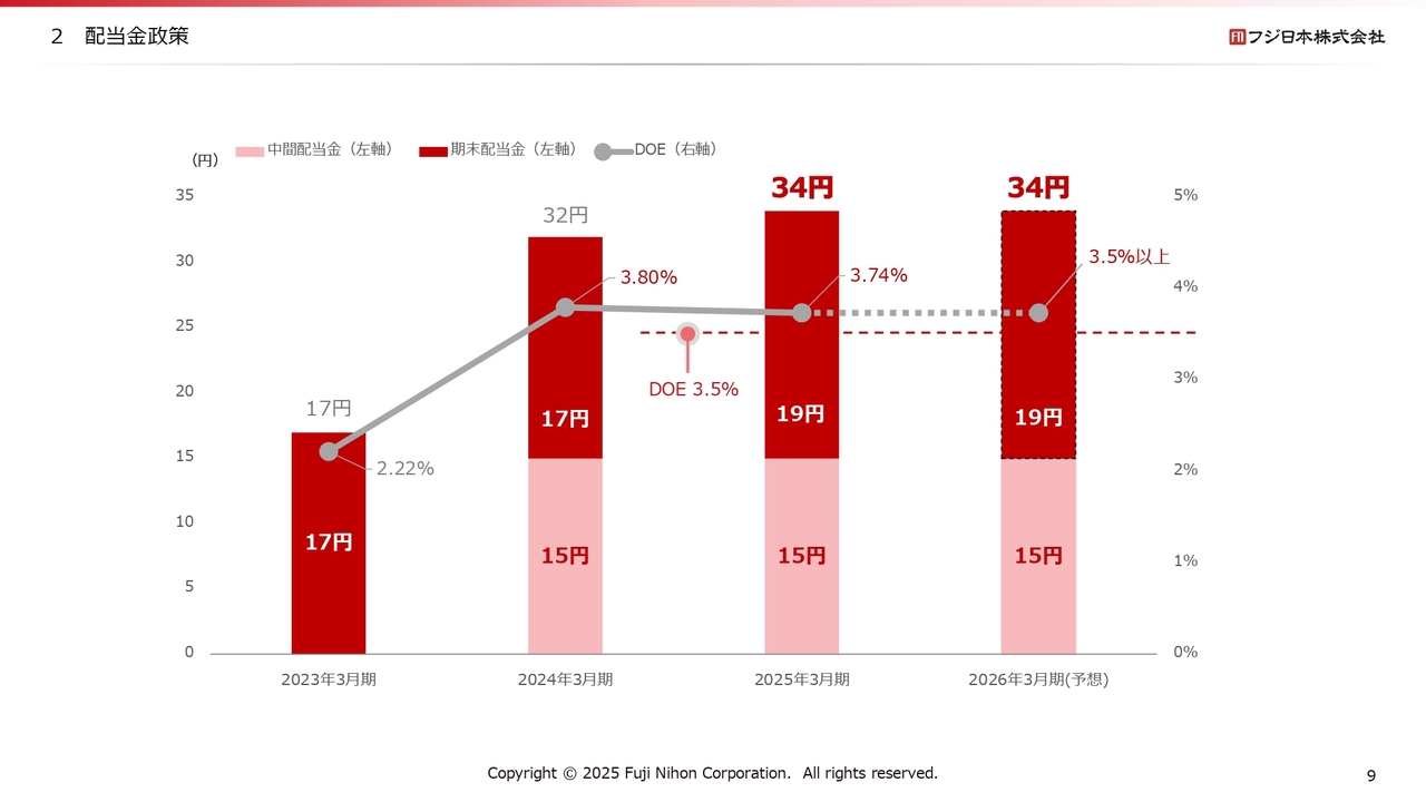 2026年3月期中間期の配当金については、基本方針を踏まえて検討した結果、1株当たり15円とし、年間配当金の合計は1株当たり34円を見込んでいます。