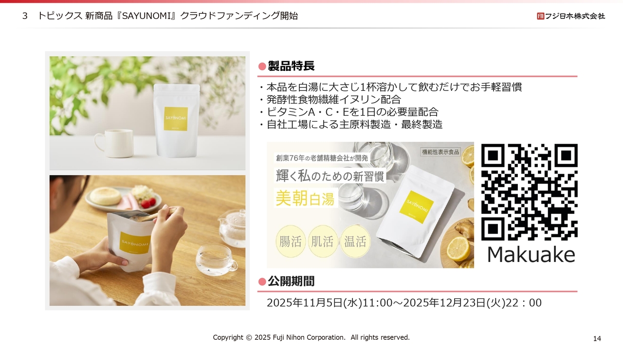 最後に、自社の発酵性食物繊維イヌリンを配合した機能性表示食品「SAYUNOMI」を、2025年11月5日(水)よりクラウドファンディングサイトMakuakeにて先行して販売開始しました。今回公開した「SAYUNOMI」は、腸活・肌活・温活などで白湯を飲む習慣に着目し、“新しい行動を増やさずに整える健康”の実現をコンセプトに開発しました。発酵性食物繊維イヌリンの摂取により「お通じの改善」「肌の健康を助ける」機能が報告されている機能性表示食品で、毎朝の白湯に混ぜるだけで、日常に無理なく取り入れられる点が特長です。