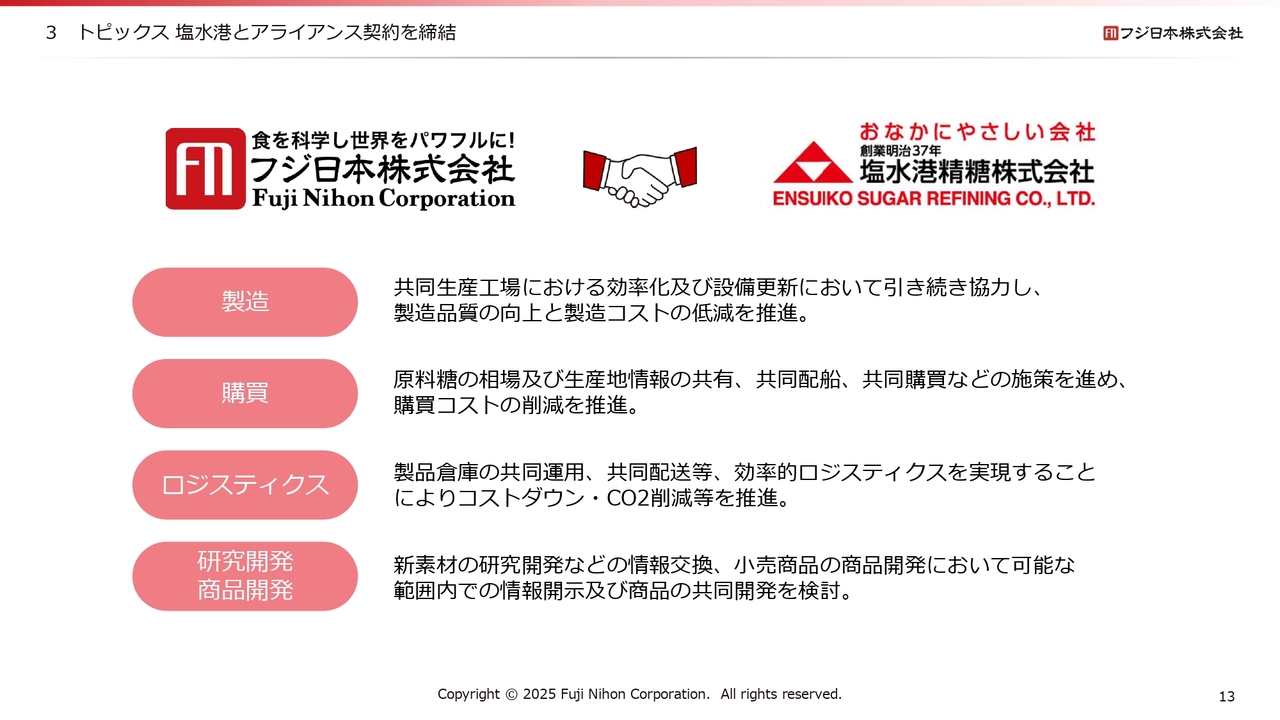 4点目として、2025年10月29日(水)、当社は塩水港精糖株式会社と、精糖事業の基盤強化、機能性事業のシナジー追求を目指し、アライアンス契約を締結しました。