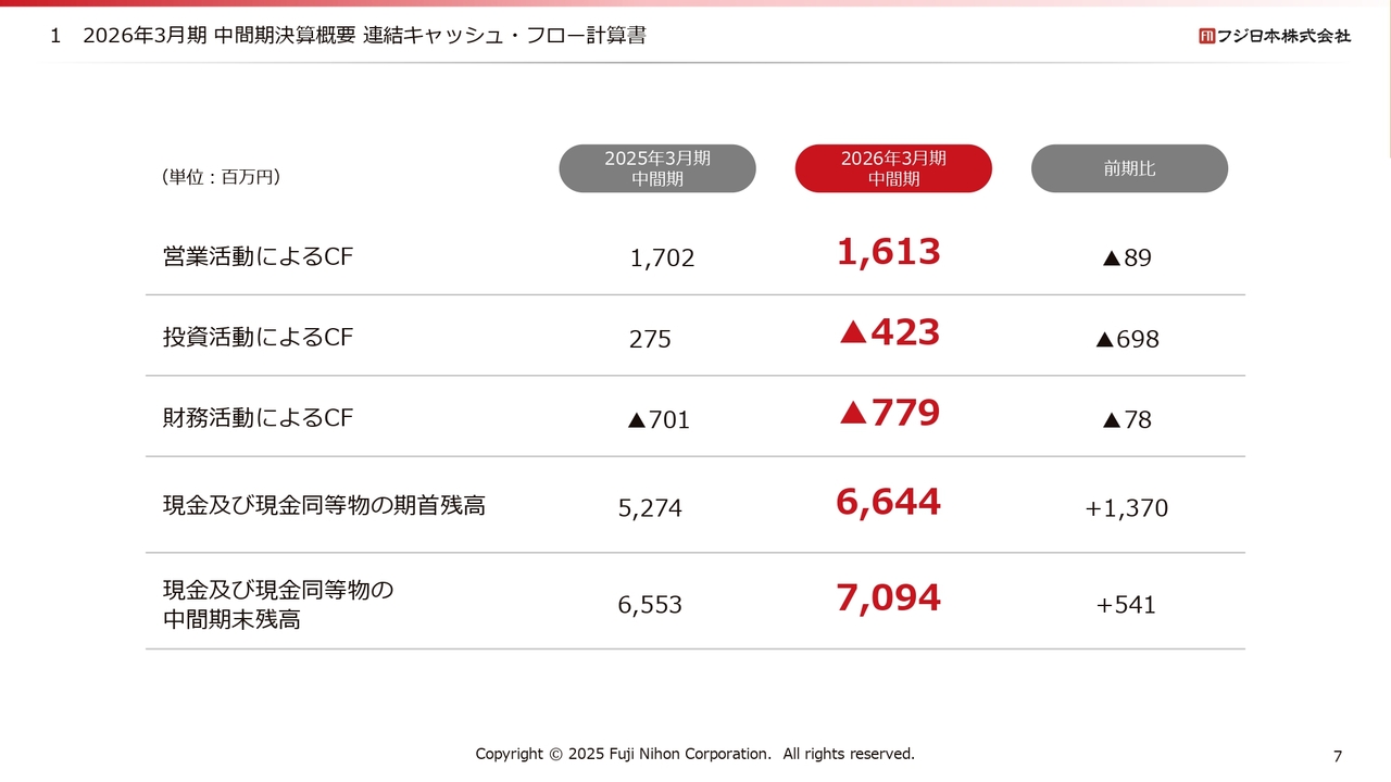 結果、当会計年度中間期末時点での現金及び現金同等物残高は、前年同期比で5億4,100万円増加し70億9,400万円に至りました。