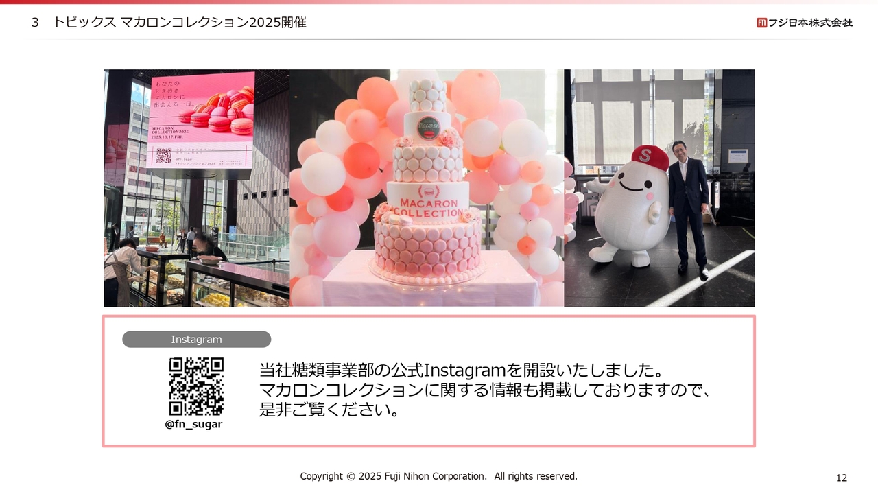 3点目として、2025年10月17日(金)、全日本マカロン協会監修のもと「マカロンコレクション2025」と題した全国の新作マカロン即売会とマカロンタワーの展示を実施しました。マカロンタワーは株式会社イートクリエイターにてご活躍の前野シェフによる作品です。