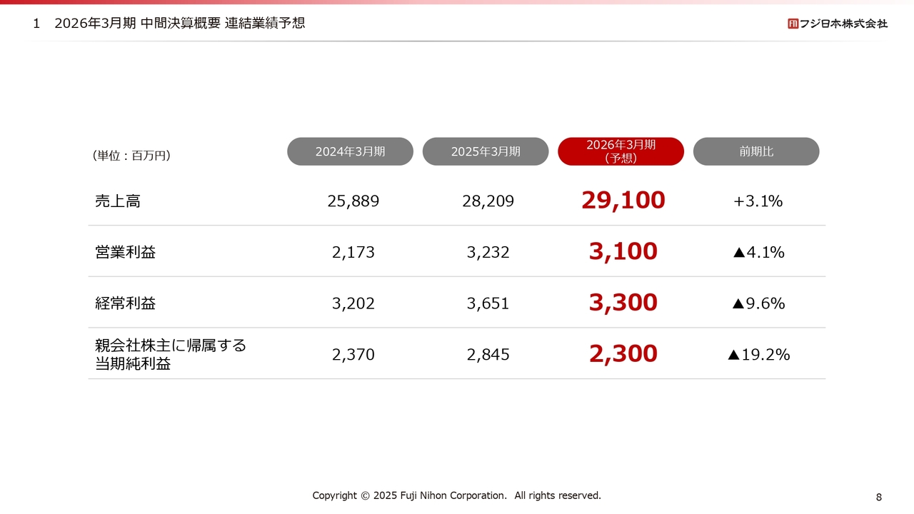 連結業績見通しについてご説明します。2025年4月30日に開示した予想に対して概ね計画どおり推移しています。したがって、2026年3月期の連結業績予想は修正しておらず、売上高291億円(前年同期比3.1パーセント増)、営業利益31億円(同4.1パーセント減)、経常利益33億円(同9.6パーセント減)、親会社株主に帰属する当期純利益23億円(同19.2パーセント減)を見込んでいます。