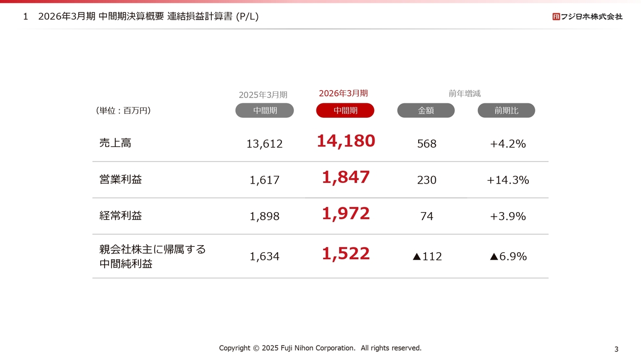 1 2026年3月期 中間期決算概要 連結損益計算書 (P/L)