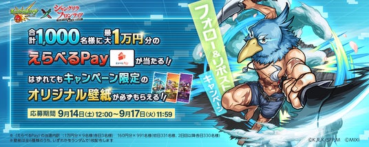 モンストキャンペーン公式 Xアカウント (https://x.com/monst_campaign) から投稿される対象ポストを期間内にリポストすると、さまざまなスマホ決済サービスのポイントを自由に選べる「えらべる Pay」最大1万円分が抽選で 1,000 名様に当たります。抽選にはずれても、本キャンペーン描き起こしのスマホ壁紙(全 6 種)から、1 種が必ずもらえます。