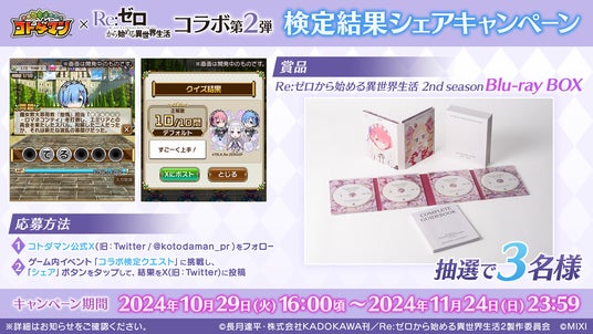 また、本日10月25日(金)よりコラボ記念スペシャルPVを公開します。そのほか、コラボ開催を記念して、「TVアニメ『Re:ゼロから始める異世界生活』コラボ第2弾召喚コトダマンセット」や「Re:ゼロから始める異世界生活 2nd season Blu-ray BOX」などが抽選で当たるXキャンペーンを開催します。