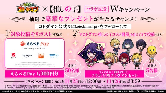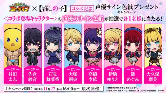 「『コトダマン』×TVアニメ『【推しの子】』コラボ召喚コトダマンセット」や「高橋李依さん(アイ役)」「大塚剛央さん(アクア役)」「伊駒ゆりえさん(ルビー役)」などの声優サイン色紙が抽選で当たるXキャンペーンを開催します。