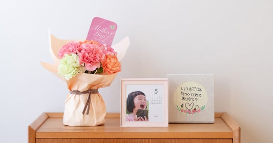 自由に選べるギフト中でも「みてね」イチオシの組み合わせは、今年の母の日限定カラー「さくら色」のボックスカレンダーと、お花の中でも一番人気の「ピンクのカーネーションブーケ」の華やかながらも柔らかな印象のギフトセットです。