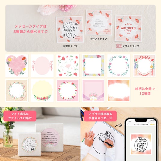 絵柄は12種で、メッセージタイプは、手書き・テキスト・デザインタイプの3種類から選べます。