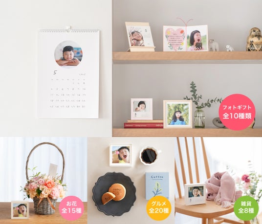 5月11日(日)の母の日に合わせて、「みてね」では、ご家族との心通う瞬間のお手伝いができればと、フォトギフト(全10種)と、お花(全15種)・グルメ(全20種)・雑貨(全8種)がセットになった「みてね母の日ギフト2025」をご用意しました。