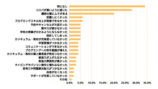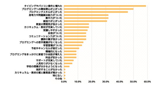 1位は「タイピングやパソコン操作に慣れた」でした。3割以上の方が選んだのは「プログミングへの興味関心が上がった」「プログミングスキルが上がった」「思考力や問題解決能力がついた」「集中力がついた」「創造力が上がった」です。