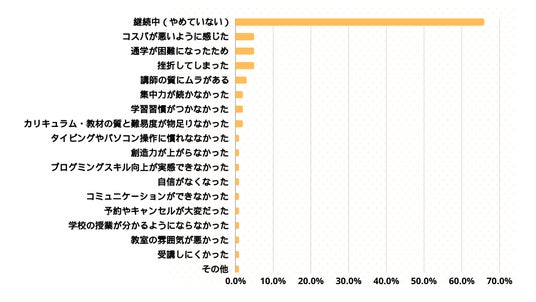 約7割の方が継続中と答えています。プログラミング教室への不満で料金や講師の質が上位にあがっていたものの、やめた理由で突出した項目がなかったことから、これらの要因が単独で受講者が辞める決定的な理由にまでは至っていないようです。