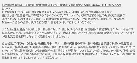 M&A仲介協会は、会員に対し「経営者保証に関する基準」(※2)を定めています。M&A取引において、経営者保証が解除されないことが懸念される場合等について、書面を交付して明確に説明する義務を課しており、不適切なM&A取引に対する抑止効果は大きいと考えております。