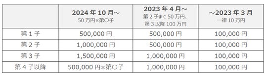 2023年4月に続いて2回目の改定となる今回は、出産人数に応じて祝金を増額する仕組みとしました。子どもの人数に応じて500,000円ずつ増えていく仕組みで、第四子以降は200万円以上となります。具体的な金額は下記となります。なお、昨年の制度利用者数は41名でした。
