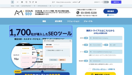 株式会社Faber Company(ファベルカンパニー/本社:東京都港区、代表取締役:稲次正樹・古澤暢央)は、新しい機能として、ノーコードで簡単にWebページを編集できるエディタ機能「ページカエタロウ (β)」の提供を開始したことをお知らせいたします。