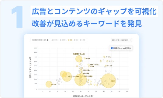 「成果が出ているキーワードをもとに、検索流入とコンバージョンを増やすコンテンツを効率よく作成する」 という、一貫したコンテンツマーケティングを実現できます。