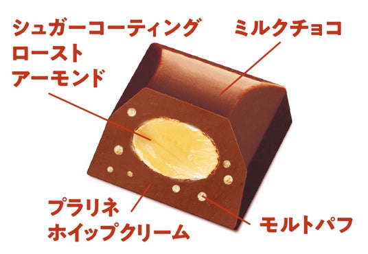 ・シュガーコーティングされたローストアーモンドをまるごと1粒入れ、モルトパフ入りのプラリネホイップクリームをセンターに入れた贅沢な大粒ルックチョコレート