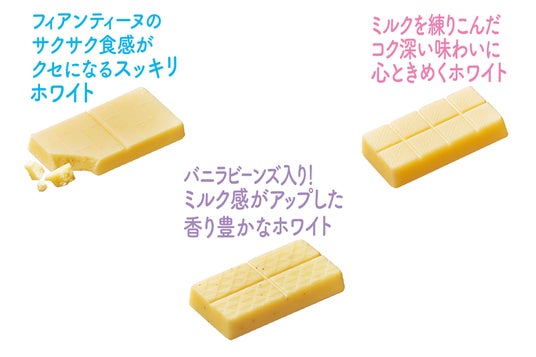 ・フィアンティーヌ入りでサクサク食感がクセになる「サクサクホワイト」、バニラビーンズ入りで豊かな香りの「バニラホワイト」、ミルクを練り込んだ深いコクの「コク深ホワイト」の3つのホワイトチョコレートが楽しめるアソートボックス