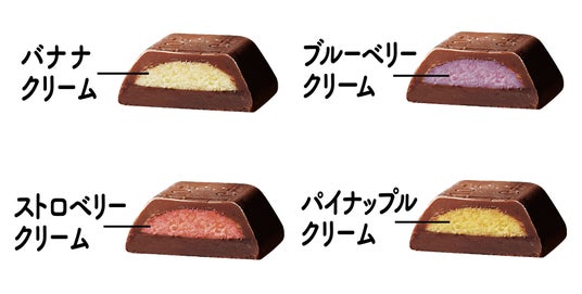・バナナ、ブルーベリー、ストロベリー、パイナップルの4つのフルーツクリームがそれぞれ入ったミルクチョコレート