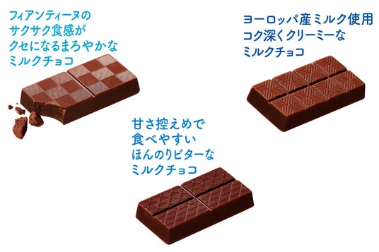 ・「スイートビターミルク」を新たに追加、「サクサクミルク」はまろやかな甘さへリニューアルし、3種の味わいの違いがより楽しめる