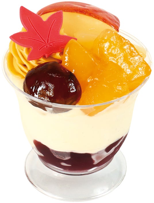 巨峰ゼリーにバニラムースをのせ、りんご、紅はるかペースト、シロップ漬けの洋梨、キャラメル風味のりんごプレザーブ、渋皮栗甘露煮を飾りました。もみじの形のチョコアタッチメントを添えた、秋の味覚満載のパフェです。