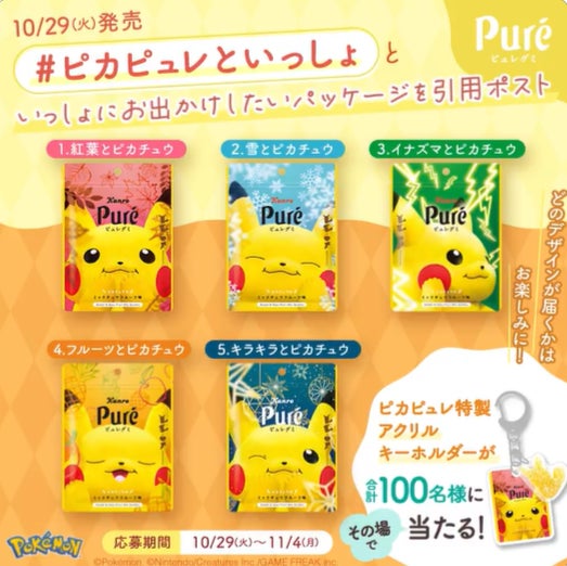 ピュレグミ公式Xのアカウントをフォローし、引用ポストで「#ピカピュレといっしょ」をつけて、この秋いっしょにおでかけしたいパッケージを投稿してくださった方の中から、抽選で100名様に「特製アクリルキーホルダー」をプレゼントします。