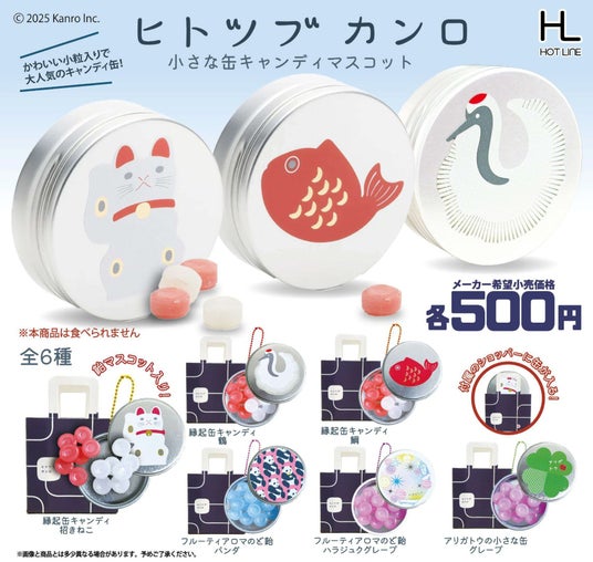 カンロ飴やピュレグミなどでおなじみのカンロ株式会社(本社:東京都新宿区、代表取締役社長 村田 哲也、以下 カンロ)は、株式会社ホットライン(本社:大阪府大阪市、代表者 楊 偉国、以下ホットライン)より発売するヒトツブカンロで大人気の「小さな缶キャンディ」シリーズを再現したカプセルトイ「ヒトツブカンロ 小さな缶キャンディマスコット」(1回500円・税10%込、全6種)を、2025年3月17日(月)より東急プラザ原宿「ハラカド」3Fにある情報発信拠点「カンロひとつぶ研究所」で発売いたします。また本商品は、全国のドリームカプセル株式会社(本社:愛知県名古屋市、代表取締役 都築 祐介、以下ドリームカプセル)の直営店舗でも3月3週目より順次発売予定です。