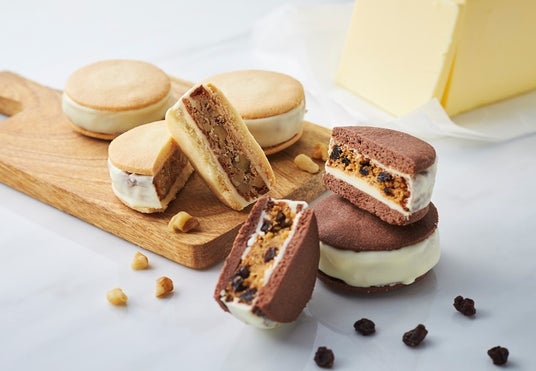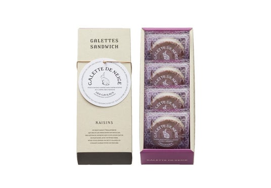 北海道産のバターを使用し、ラム酒漬けの香り高いレーズンがぎっしり入ったしっとり食感のケーキを、ミルキーなホワイトグラサージュでコート。カカオと小麦が香る、口どけの良いガレットでサンドしました。