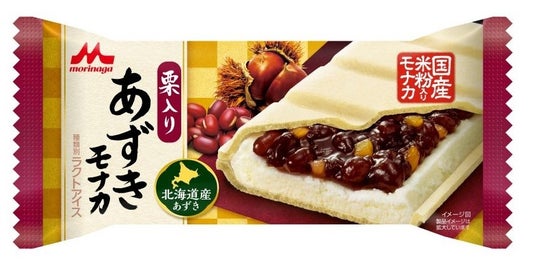 栗入りあずきモナカ」は北海道産あずき使用の栗粒入り餡と自然な甘さのバニラアイスをサンドした和風モナカです。今回のリニューアルを機に、モナカは国産米粉の使用量を2倍に増量した特製モナカに進化し、和菓子らしい味わいを追求しています。