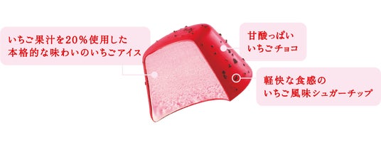 いちごアイスにはいちご果汁を20%配合しており、本格的な味わいが感じられます。また、真っ赤ないちごチョコには軽快な食感のいちご風味シュガーチップを混ぜ込んでいるので、いちご感がさらに強まり、食感のアクセントも体験できます。