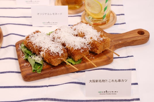 未来の大阪新名物を狙った「大阪新名物?!これも串カツ」をはじめ主要メニューを公開。『この万博をきっかけに、動物性に並ぶくらい植物性のチーズメニューも選択できる社会をめざす』と宣言。